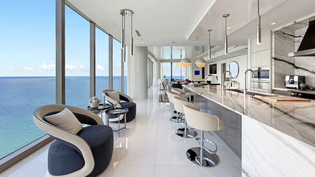 The four-bedroom condo at The Estates at Acqualina pairs the marque brand’s exquisite craftsmanship, high-tech materials, and signature Bleu Royal Carbon hue. The four-bedroom condo at The Estates at Acqualina pairs the marque brand’s exquisite craftsmanship, high-tech materials, and signature Bleu Royal Carbon hue.
